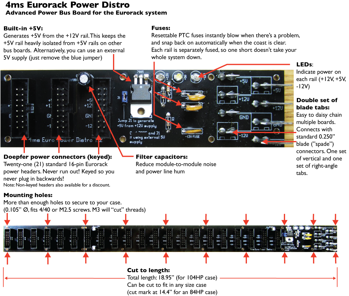 The 4ms Eurorack Power Distro Board is a fully-featured bus board with several advanced features.
